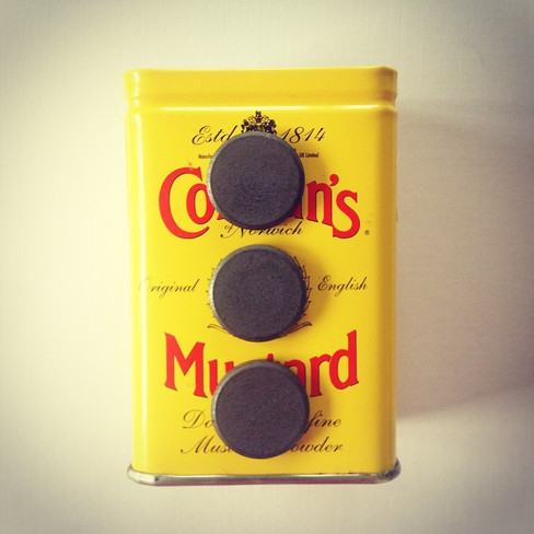 I tend to keep certain things in case I think if an idea to upcycle it into something different. I love something that would have been discarded into something that looks cool and useful. One of my favourite tins is this mustard tin and on the plus side I have had a real thing for mustard lately! I had this tin in my home studio and I came across the magnets I bought but you can also recycle some old magnets you no longer like or use.